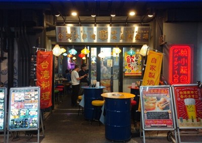 電飾の黄色い看板メニューや、ドラム缶テーブルなど台湾の夜市感が満載です。