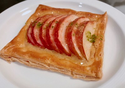 人気のアップルパイは、サクサク食感の生地の上に独自の甘いリンゴフィリングがのっています。