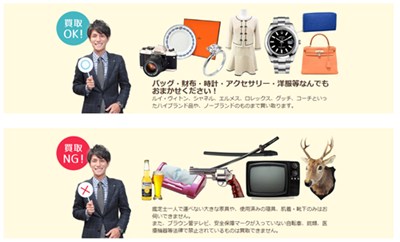 買取不可のもの:植物・切手・家具・ビデオ・刀剣類・銃類・酒・飲食物・医療機器・電子機器・下着など