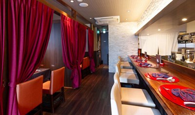 山手幹線沿いのコンクリート打ち放しのビル1階で、赤を基調にした中国風のお洒落な店内は、天井が高く開放感があります。
