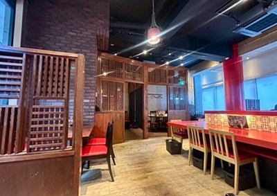 山手幹線沿いのコンクリート打ち放しのビル1階で、赤を基調にした中国風のお洒落な店内は、天井が高く開放感があります。
