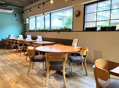 ウッディ―調のさわやかな外観で、おしゃれなテーブルやいすが並ぶ店内は、温かみを感じる空間です。
