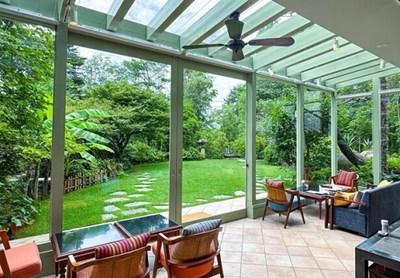 側面の大きな窓が特徴的で、景色が見えるガラス窓から木漏れ日が差し込んで明るく開放的です。