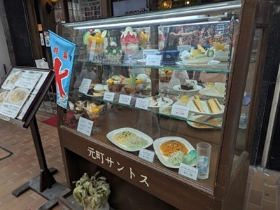 黒い外壁と大きなガラス張りの店頭が目印で、入り口の手前には昔ながらのショーケースのサンプルが飾られたレトロな見た目。