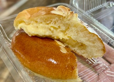 人気のクリームパンは、香ばしく焼き上がった生地にオレンジ色に近い濃厚なクリームが詰まっています。