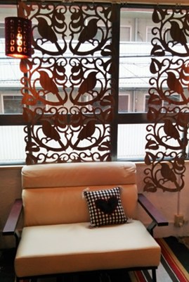 淡いブルーのドアや壁面に置かれた鮮やかな赤い色の大きな手のイスが目印です。