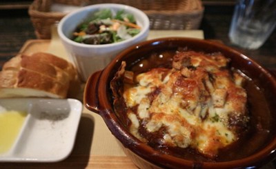 人気の「グラタンセット」は、熱々のグラタンにパン・サラダ・飲み物付き。
