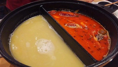 そしてこの2つのスープを陰と陽に見立て、仕切りのついた専用鍋でいただくのが一般的です。