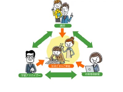 サービスの特徴:講師と学習アドバイザー、お客様相談室のスタッフが一丸となって生徒と家庭をサポート!未就学~大学受験まで幅広い年齢にも対応!
