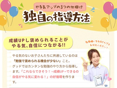タイプに合わせて簡単な勉強のやり方を教える「グッド独自の指導方法」で勉強を教えるスタイルで、子供が自分から楽しんで勉強に取り組めるようにサポート。