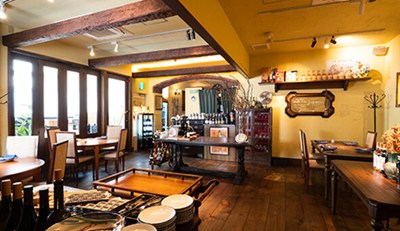 イタリアカラーの旗や看板が目印で、店内はブラウン中心のクラシカルで落ち着いた雰囲気です。