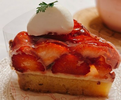 クリームとスライスアーモンドに包まれ、トップにはフレッシュな苺が二列並んだ豪華な一品です。