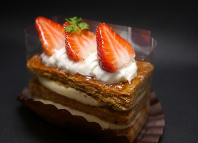 人気の「苺のミルフィーユ」は、バターの香りと風味を感じる生地にミルキーなカスタードクリームを重ねたミルフィーユ。
