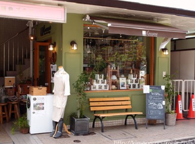 オリーブグリーンの外壁や店頭にある木製のベンチなどが印象的。