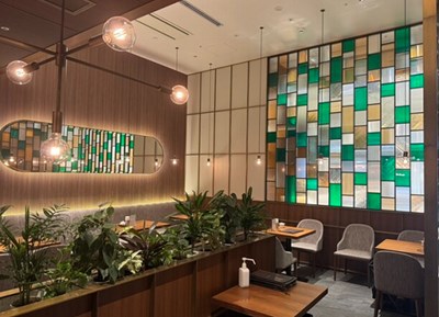 奥のスペースは広く開放的なカフェになっていて、照明やステンドグラス調の壁が落ち着いた雰囲気になっています。