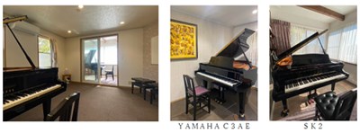 広々とした教室の中に「YAMAHA C3AE」や「SK2」などのピアノがあり、ゆったりした空間です。