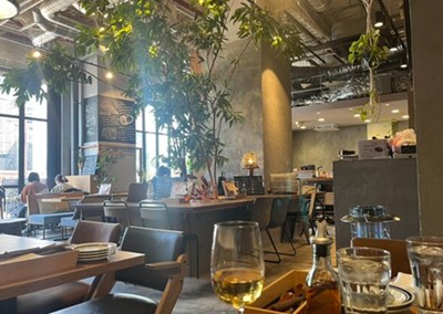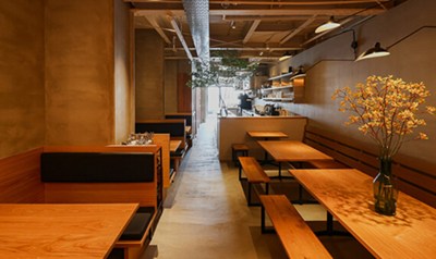 全体的にグレーンの色調でシックな外観で、広々として開放感がある店内は、木の温もりが感じられる温かみのある空間になっています。