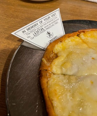 ピザ1枚1枚に今までの枚数がカウントされた三角のナンバリングカードが添えられています。