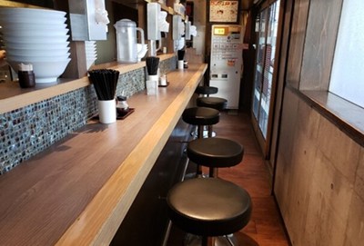 紅白ストライプの鮮やかな壁が印象的な店内で、カウンターの椅子にはラーメンのイラストや壁に貼ってあるユニークな絵など遊び心満載です。