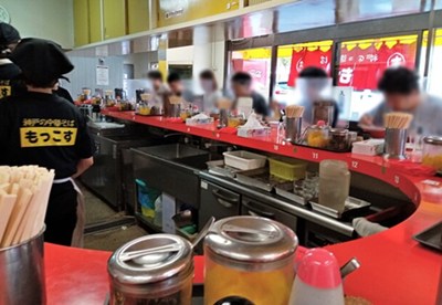 赤い看板に書かれた「も」に丸印の絵がトレードマークで、よく目立ちます。