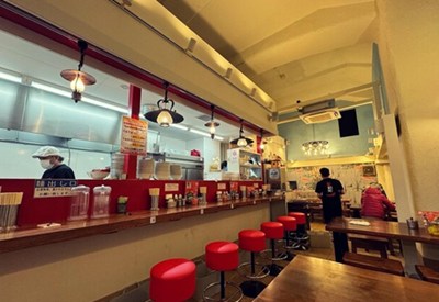 奥行きのある店内は、赤いカウンターと椅子がポップな雰囲気がでています。