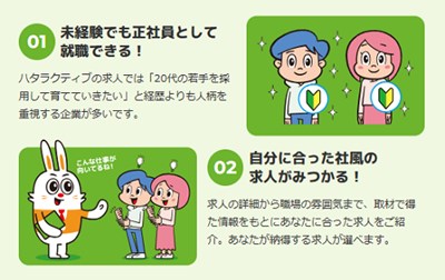 内定率80%以上!初めての就職や未経験業界への転職に強い就職・転職支援サービス「ハタラクティブ」。