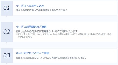 申込みから7日以内に担当者から電話またはメールで連絡が届き、キャリアアドバイザーと面接となります。