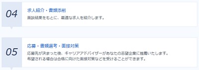 その後、求人紹介や企業に提出する書類の添削などが行われ、応募先決定後アドバイザーが応募する企業に推薦し応募が完了します。