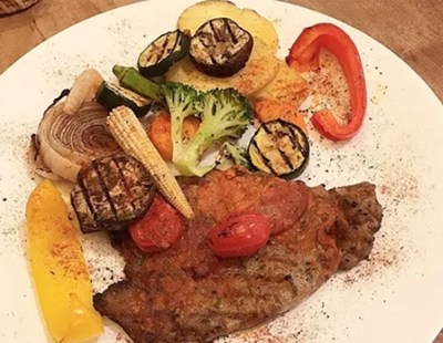 人気の「どんぐり豚のスパニッシュステーキ」は、ナッツや野菜の旨みがつまったロメスコソースのステーキ。