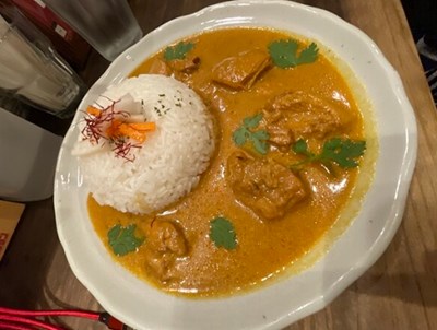 コリアンダーの香りと生のパクチー の香りが漂う優しい味付けの「ココナッツミルクチキンカレー」は辛さ控えめ。