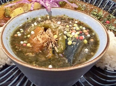 四万十鶏からとったダシで作る魚介類やフレッシュ野菜がのったスパイスカレーは和風だしが効いた深い味わい。