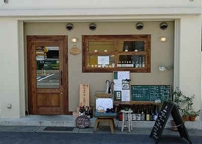 木枠の扉やメニューが描かれた看板がカフェのような見た目で、店内はコンクリート打ちっ放しのおしゃれな空間です。