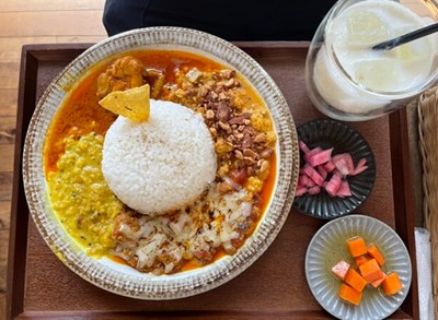 四万十鶏からとったダシで作る魚介類やフレッシュ野菜がのったスパイスカレーは和風だしが効いた深い味わい。