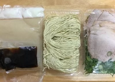 スープ・具材・麺など別々にラッピングされた中華そばの持ち帰りが2人前分から可能で、ニラコショーやニンニクチップなどのトッピングも注文できます。