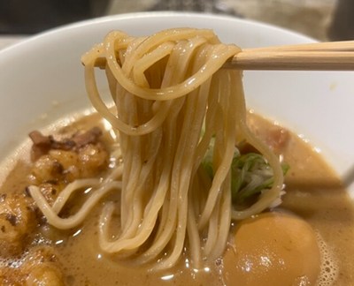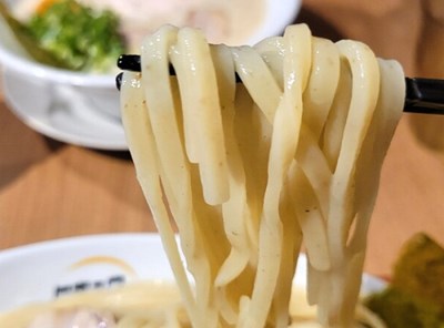 ツルツルでモチモチの食感の自家製麺は、多加水で全粒粉が入っています。