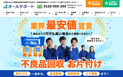 大阪を中心に神戸エリア全域・年中無休で対応する不用品回収業者「オールサポート」。