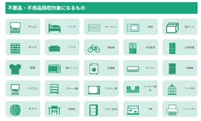 取扱い商品:不用品・オフィス不用品・大型不用品・粗大ごみ・引越し不用品など