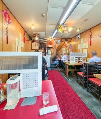 赤色のひさしに大きく書かれた店名がよく目立ち、店内は歴史を感じる大衆中華の雰囲気が広がります。