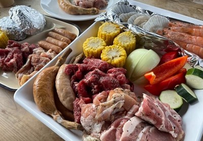・まんぷくBBQ(本日のサラダオードブル、国産牛肉(100g)、スペアリブ ソーセージ、焼野菜、焼きおにぎり 4,500円(税込)