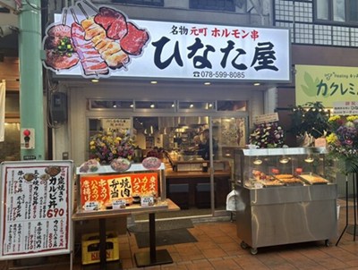 神戸市営地下鉄海岸線みなと元町駅より徒歩1分のところにある「名物元町ホルモン串 ひなた屋(旧名:焼肉ホルモン ひなた屋)」。