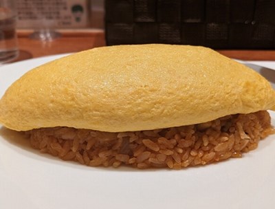 チキンライスが透けて見えそうな職人技の薄焼き卵でカバーされたオムライスは、綺麗な形でバターたっぷりのチキンライスと絶品デミソースが相性抜群。