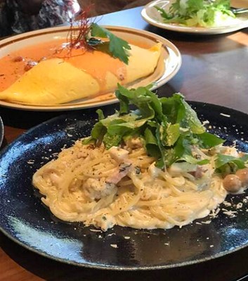 パスタやオムライスが有名で、お得なランチセットも何種類かあるぼで、お腹の空き具合やシーンに合わせて調整できます。