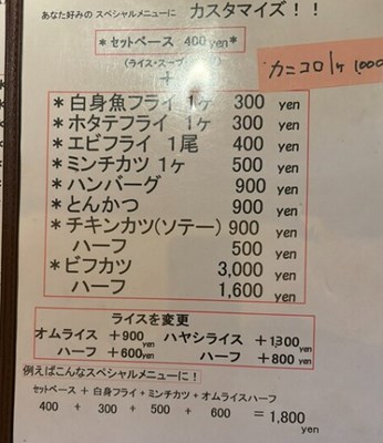 珍しいカスタマイズセットは、基本のセットベースにエビフライ・ハンバーグ・オムライスなどを選べる嬉しいスタイル。