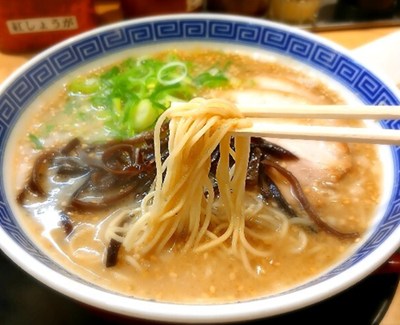九州の豚骨ラーメンの常識と言われる超極細麺を使用しており、トロミのあるスープにしっかり絡みます。