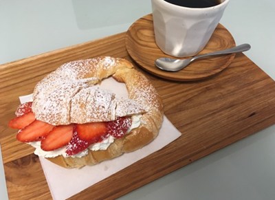 おすすめの「星のクロワッサン」は、こだわりのクロワッサンにこぼれ落ちるほどの生クリームとフレッシュなイチゴがサンドされた人気メニュー。