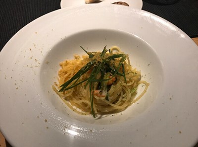 「自家製カラスミとずわい蟹と九条葱のスパゲッティー二」は、ワインとブランデーに漬け込んだカラスミをふんだんにふりかけた絶品パスタです。