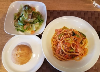ランチのパスタコースは、前菜3種・サラダ・本日のパスタ・メイン料理・パン・ドリンクが付いたお得なコース。