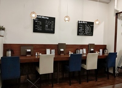 白くて明るい壁の店内には、おしゃれなランプと白と青の椅子が映えてインスタ映えする空間です。