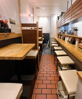 オレンジの壁とウッド調の店内は、温かみのあるお洒落な雰囲気で、一人一人のスペースが広く落ち着いています。
