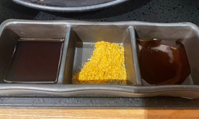 ソースはテーブルの上にあり、お好みの分量をかけていただきます。